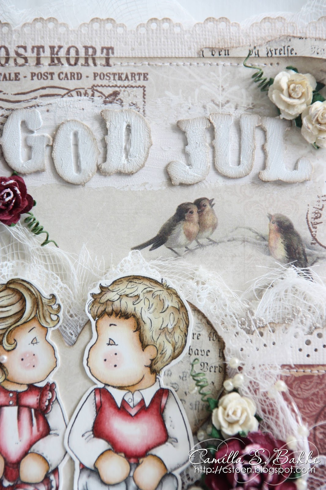 Og jeg har latt meg inspirere av fantastiske Hanne (Papirdilla), og hennes bruk av blonder og osteklut på kortene sine.