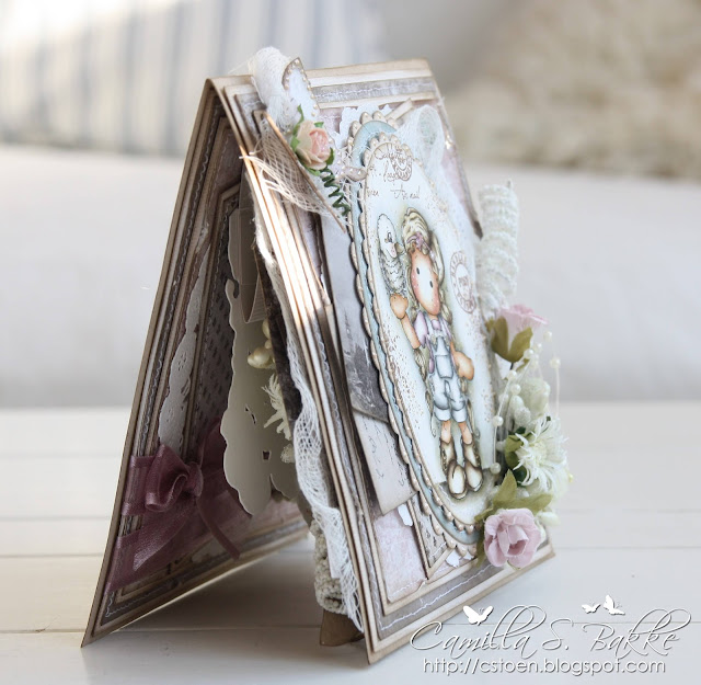 Og her kommer endelig framsiden av kortet mitt:) Samme papirer som på innsiden -Maja Design, og så har jeg brukt Tilda with her Kookaburra stempelet fra Magnolia på framsiden.
